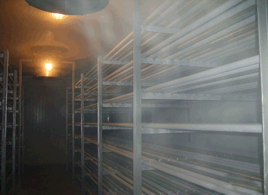 一般大型冷库多由制冷机制冷,利用气化温度很低的液体(氨或氟里昂)作为冷却剂,使其在低压和机械控制的条件下蒸发,吸收贮藏库内的热量,从而达到冷却降温的目的。
